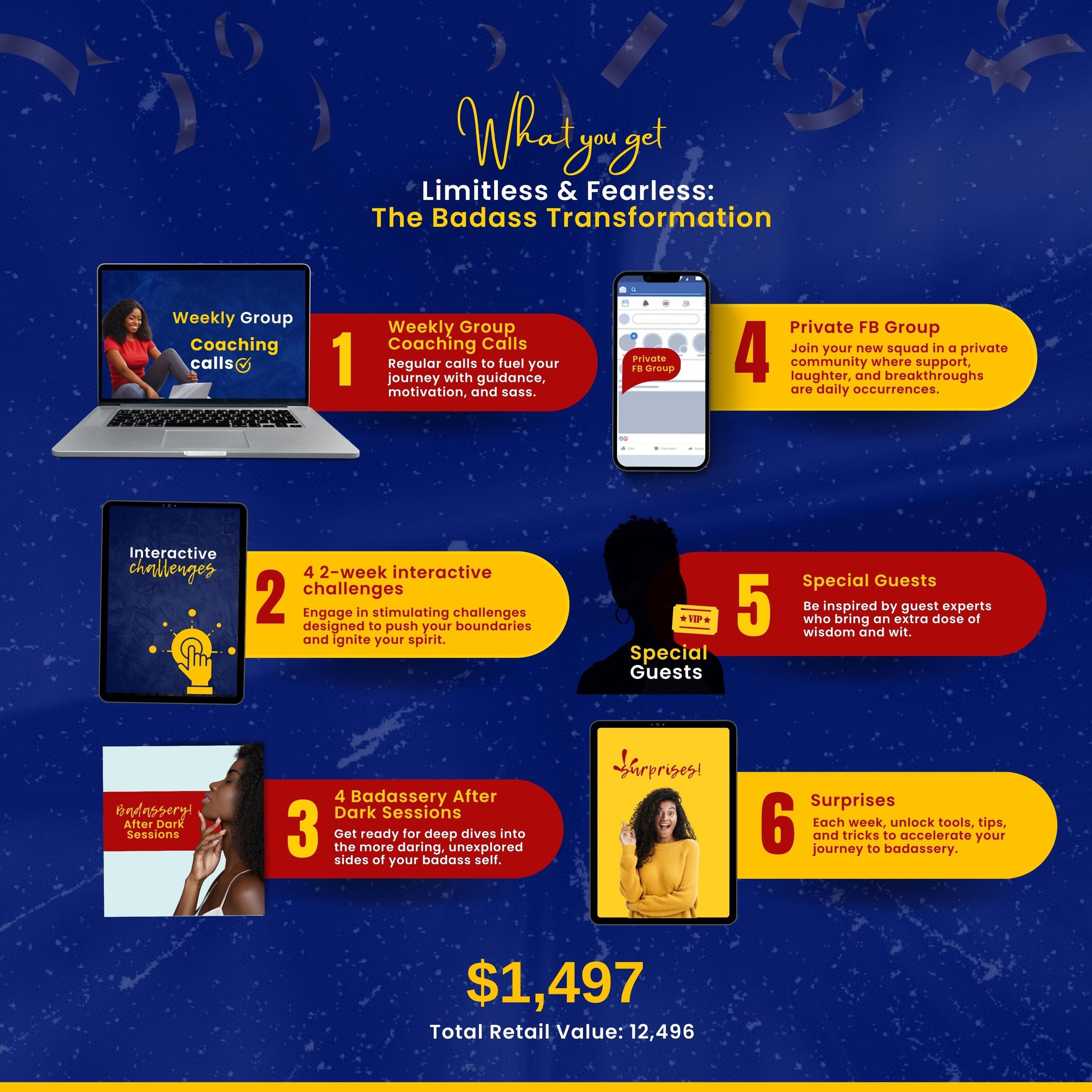 "In 'Limitless & Fearless: The Badass Transformation', you're signing up to embody these truths. This isn't about following a predetermined path or mimicking someone else's journey to confidence. It's about discovering and owning your unique brand of badass, feeling empowered in who you are, and not just who you're expected to be. Here, transformation is personal. You’re not just changing your perspective; you’re overhauling how you storm through every chapter of your life. Strap in, and get ready to unleash the supreme version of you – it's time to forge your own damn epic saga.